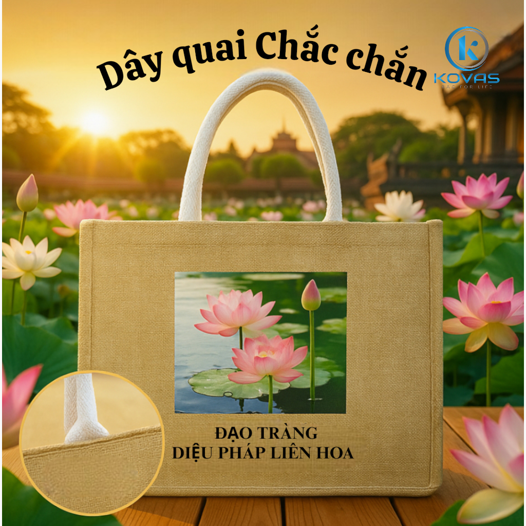 ✨ Túi vải đay Đạo Tràng Diệu Pháp Liên Hoa – Mộc mạc từ chất liệu, lan tỏa từ tâm.